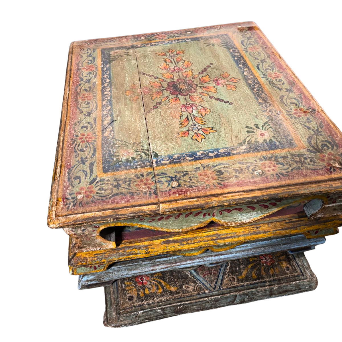 A Bajot is a low wooden table or stool that is traditionally used in Indian households. They are used as a small dining table, a platform for religious rituals and offerings or as a decorative piece. In Hindu religion the Pooja/Bajot is a symbol of reverence and devotion.